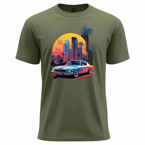 Sunset graphic t-shirt with a colorful retro car and sunset city design, offering comfort, durability, and bold streetwear style.
