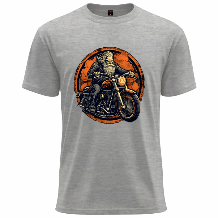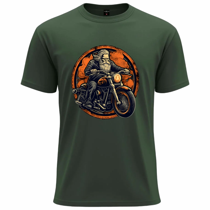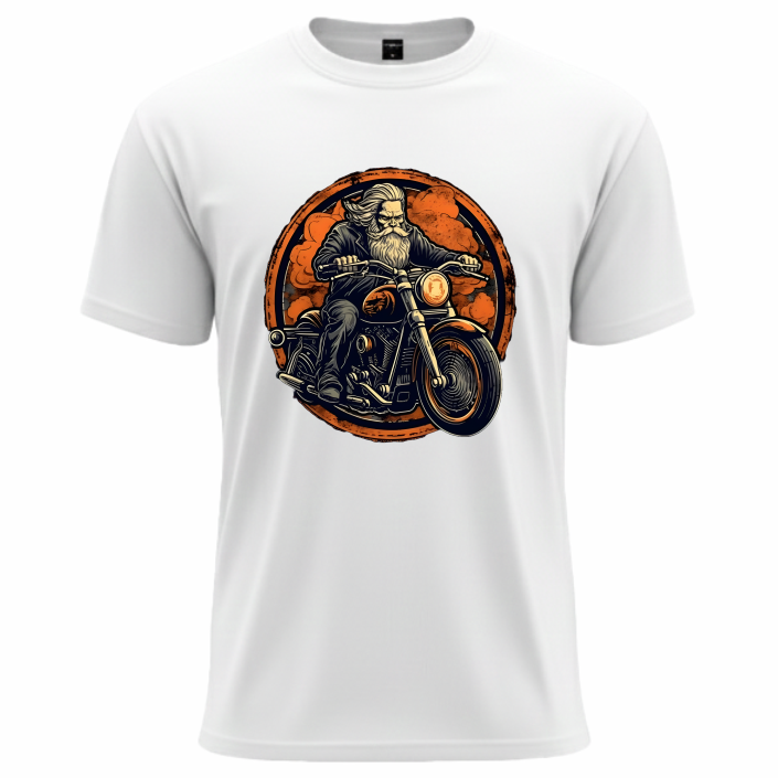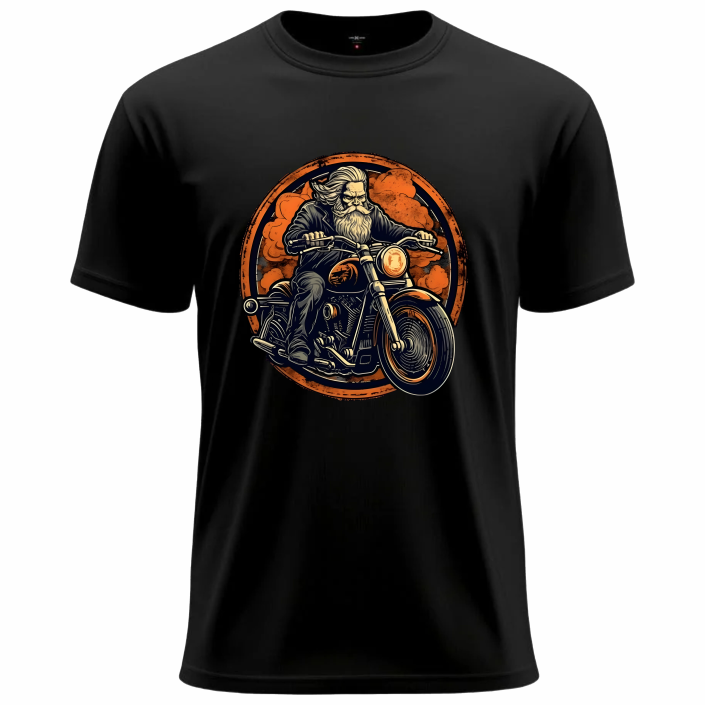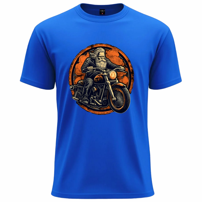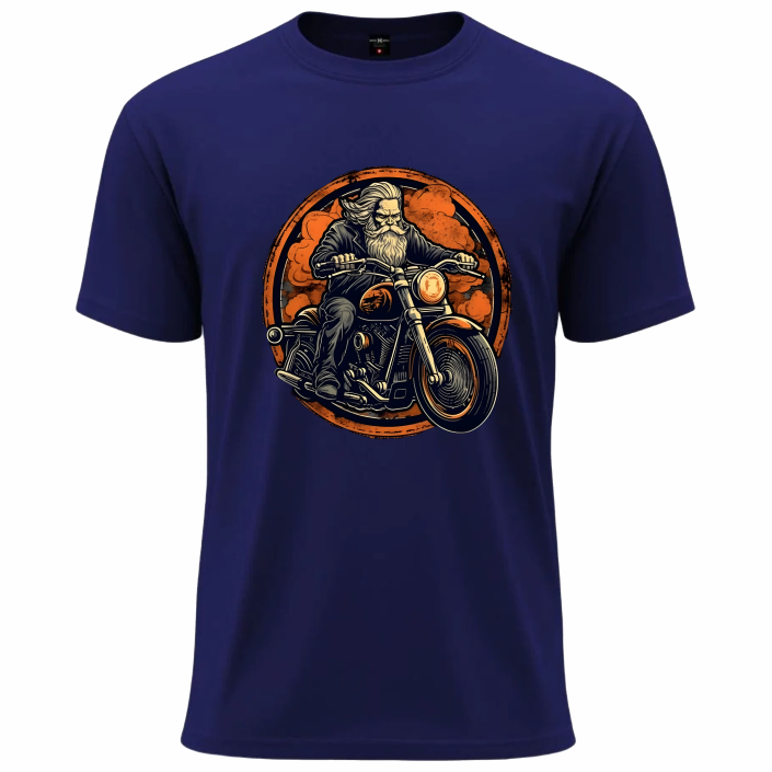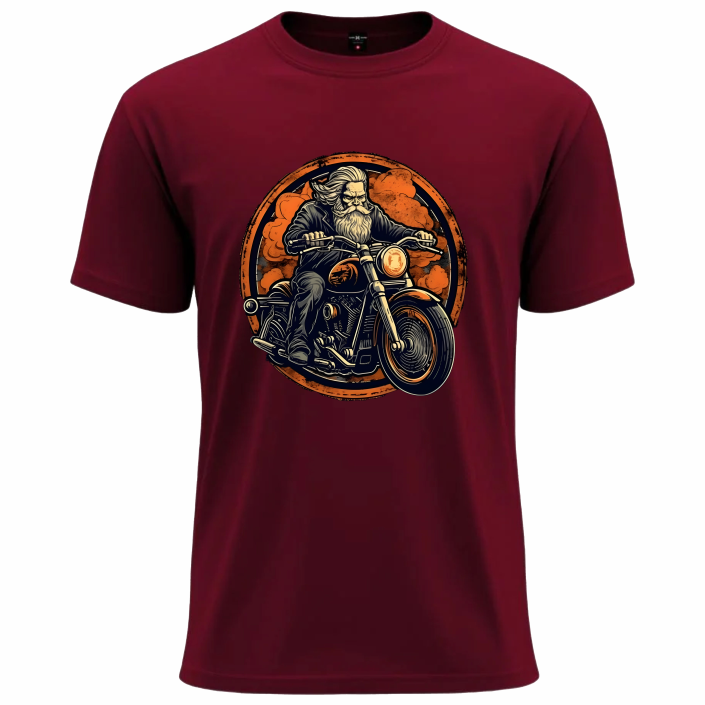 A stylish t-shirt featuring a bold vintage biker riding a classic motorcycle design. Made with soft, breathable fabric for comfort and everyday wear.