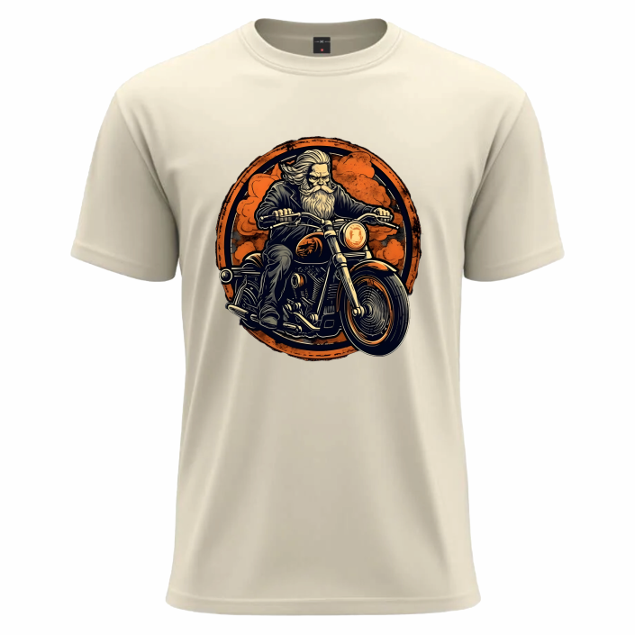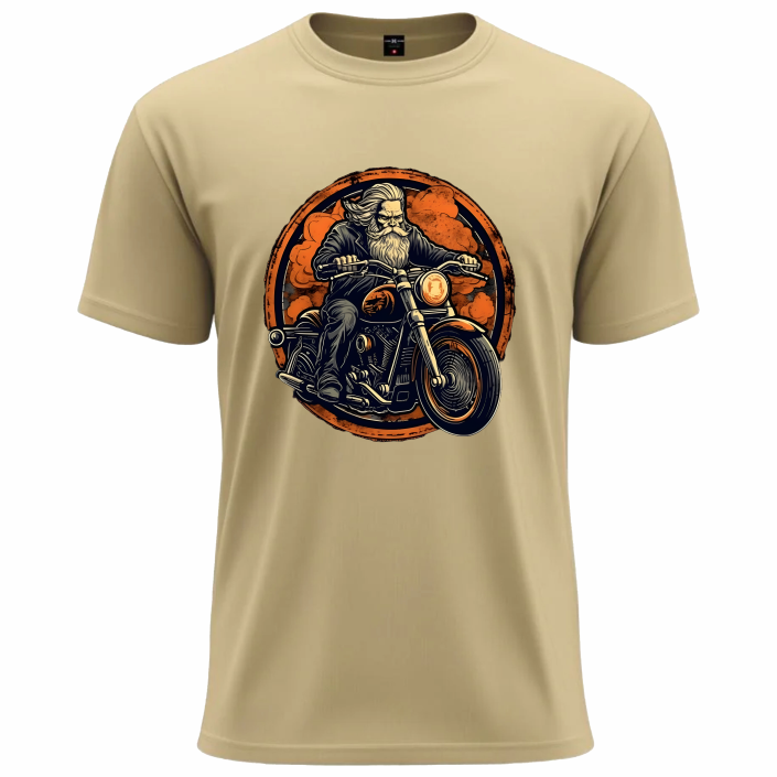 Unleash your bold spirit with the Vintage Rebel Rider Graphic T-Shirt. Featuring a powerful illustration of a rugged biker with flowing hair and beard riding a classic motorcycle, set against a striking orange circular backdrop, this design represents freedom, strength, and timeless attitude. The detailed artwork combined with the neutral beige base creates a premium and eye-catching look perfect for bike lovers and streetwear enthusiasts.